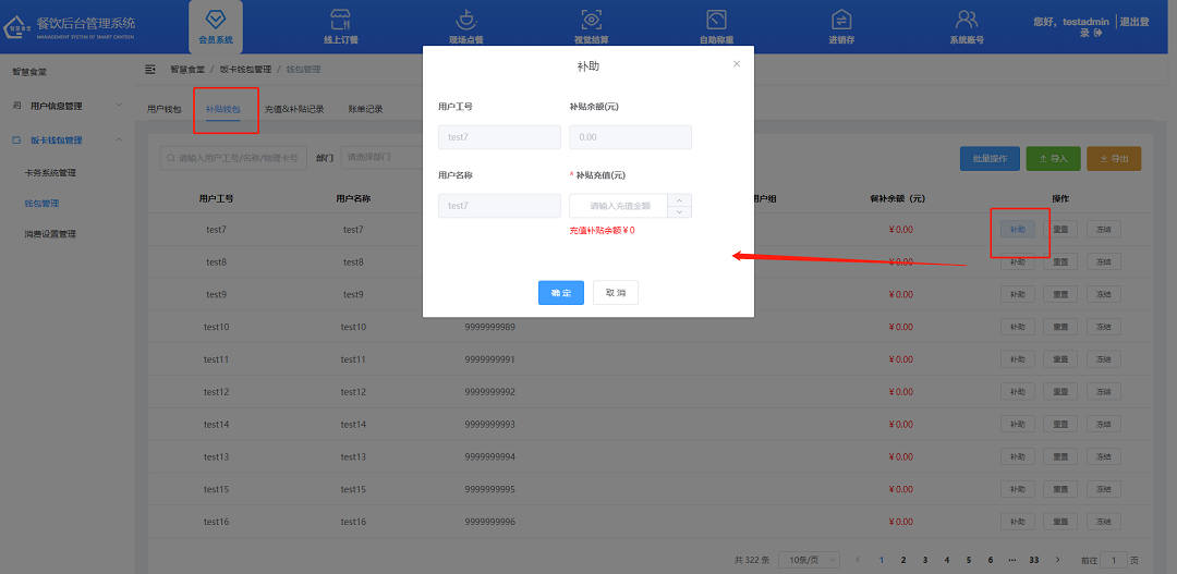 ③餐補,點擊“餐補”按鈕,輸入餐補金額,點擊“確定”按鈕,完成餐補。
