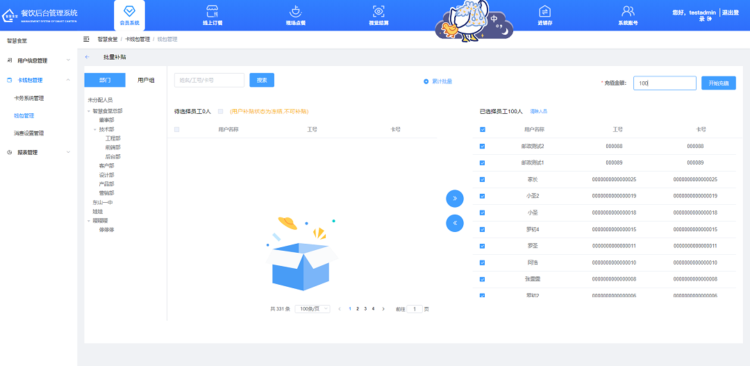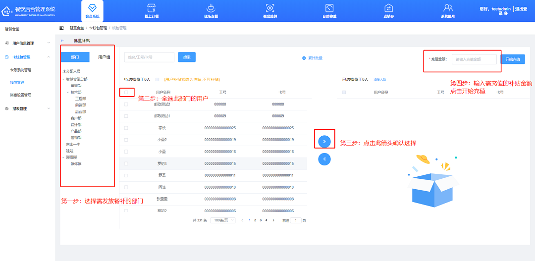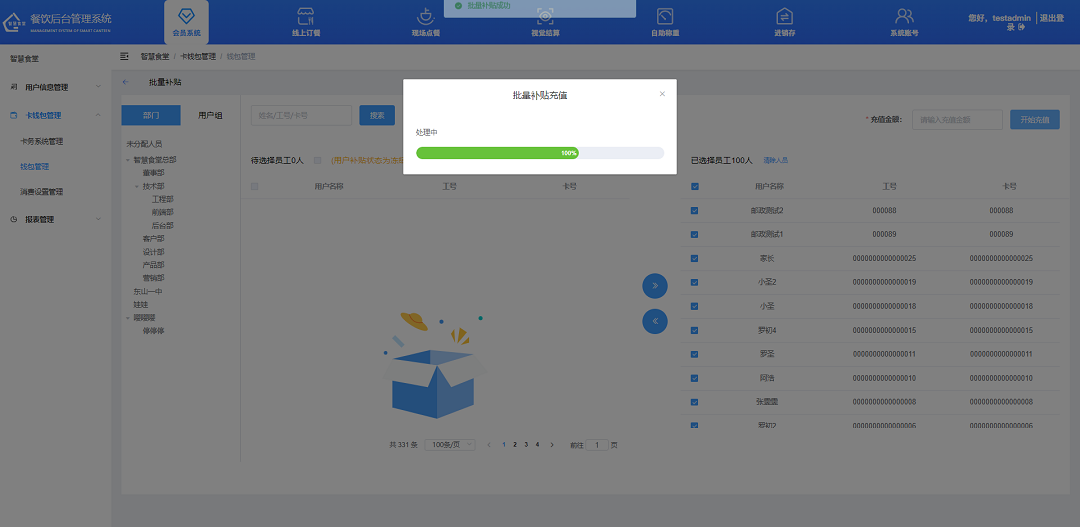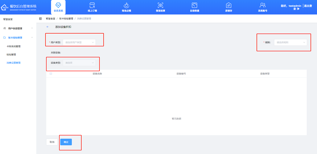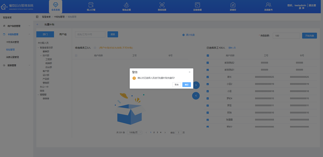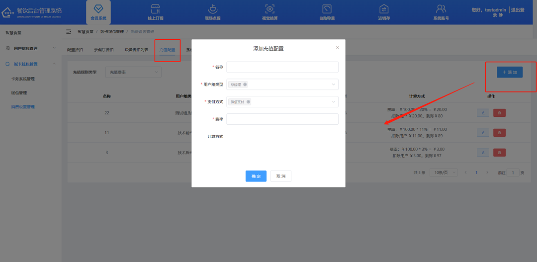 ①飯卡充值,點擊“充值”按鈕對用戶進行充值,填寫需充值的數(shù)額,選擇支付方式,點擊“確定”按鈕,完成充值;