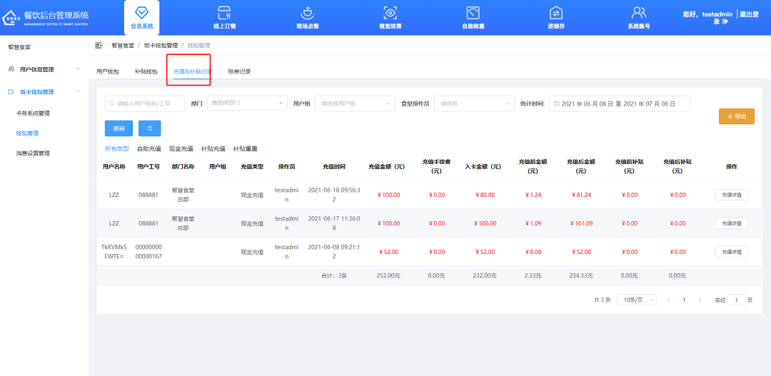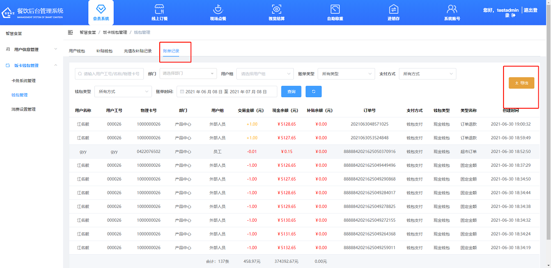 ①賬單記錄,可輸入用戶工號、名稱、卡號,篩選支付賬單類型查詢消費記錄。