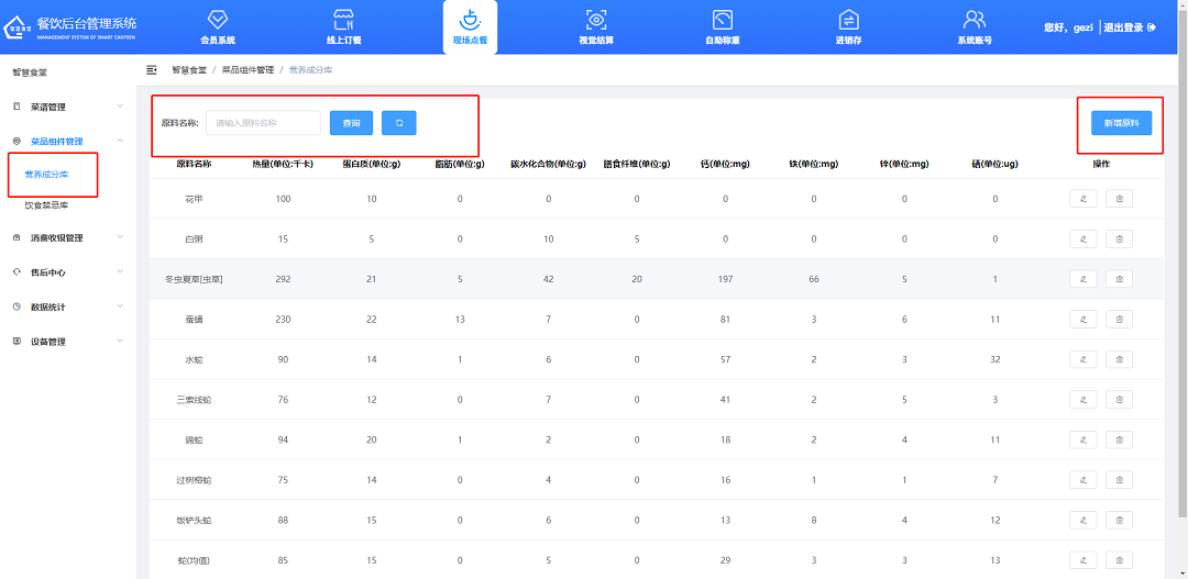 ①輸入原料名稱,可對(duì)原料進(jìn)行查詢。