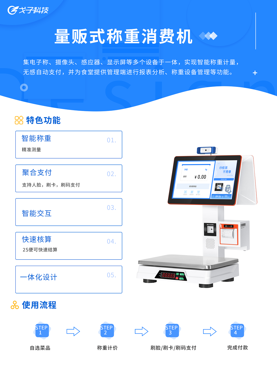 視覺結(jié)算臺(升級款),是戈子科技新研發(fā)的一款依托圖像識別技術(shù)用于團(tuán)膳領(lǐng)域?qū)崿F(xiàn)智能結(jié)算的創(chuàng)新型設(shè)備,能夠根據(jù)菜品的特性快速智能識別 “結(jié)算區(qū)”中的餐具、產(chǎn)品圖像并智能精準(zhǔn)結(jié)算,并連接一卡通等第三方支付系統(tǒng),讓就餐者快速完成支付,減少排隊時間。